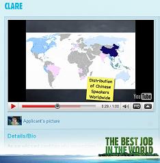 El afortunado, que se hospedará en una lujosa residencia con piscina y terreno de golf, debe ser un buen nadador, con facilidad para comunicarse y capacitado para leer y escribir en inglés. Por este trabajo de seis meses tendrán un sueldo de 105,000 Dólares Americanos. De miles de gentes que mandaron un video para explicar por que son los mejores candidatos para el puesto, solo 16 pasaron a la selección final. Son mujeres y hombres de Japon, Irlanda, Estados Unidos, Korea, Singapur, Holanda, Australia. Sus actividades actuales son: actrices, periodistas, comentaristas de radio, recepcionsitas, maestros, estudiantes. Sin embargo ningún "alto conocimiento" que hayan adquirido en la universidad los califica para este trabajo. Al observar los videos que prepararon para presentarse como candidatos, se descubre porque fueron seleccionados: - PASION.