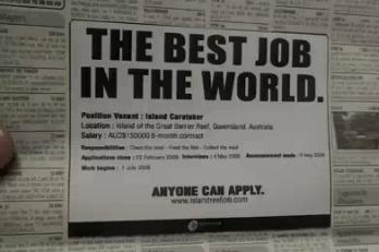 | El próximo 6 de mayo del 2009, las autoridades de Queensland en Australia, darán a conocer al afortunado ganador de lo que ellos llaman el "Mejor trabajo del Mundo". El o ella, con al menos 18 años de edad, tendrá por misión tomar el sol, vagar por las playas de arena blanca, explorar los fondos submarinos, efectuar algunos "pequeños trabajos" y alimentar cada semana un blog con fotos y vídeos.